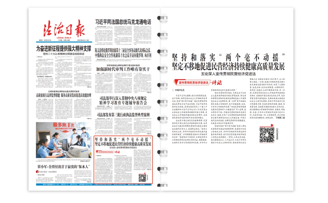 制定民營經(jīng)濟(jì)促進(jìn)法,與憲法關(guān)于社會(huì)主義基本經(jīng)濟(jì)制度的規(guī)定貫通起來,將支持和保障民營經(jīng)濟(jì)發(fā)展的法律制度融入中國特色社會(huì)主義法律體系,第一次將“毫不動(dòng)搖鞏固和發(fā)展公有制經(jīng)濟(jì),毫不動(dòng)搖鼓勵(lì)、支持、引導(dǎo)非公有制經(jīng)濟(jì)發(fā)展”“促進(jìn)民營經(jīng)濟(jì)健康發(fā)展和民營經(jīng)濟(jì)人士健康成長(zhǎng)”寫入法律。這必將有利于進(jìn)一步激發(fā)民營經(jīng)濟(jì)組織發(fā)展內(nèi)生動(dòng)力,鼓勵(lì)、引導(dǎo)廣大民營經(jīng)濟(jì)組織經(jīng)營者堅(jiān)定做中國特色社會(huì)主義的建設(shè)者、中國式現(xiàn)代化的促進(jìn)者,發(fā)揮民營經(jīng)濟(jì)在強(qiáng)國建設(shè)、民族復(fù)興偉業(yè)中的重要作用。