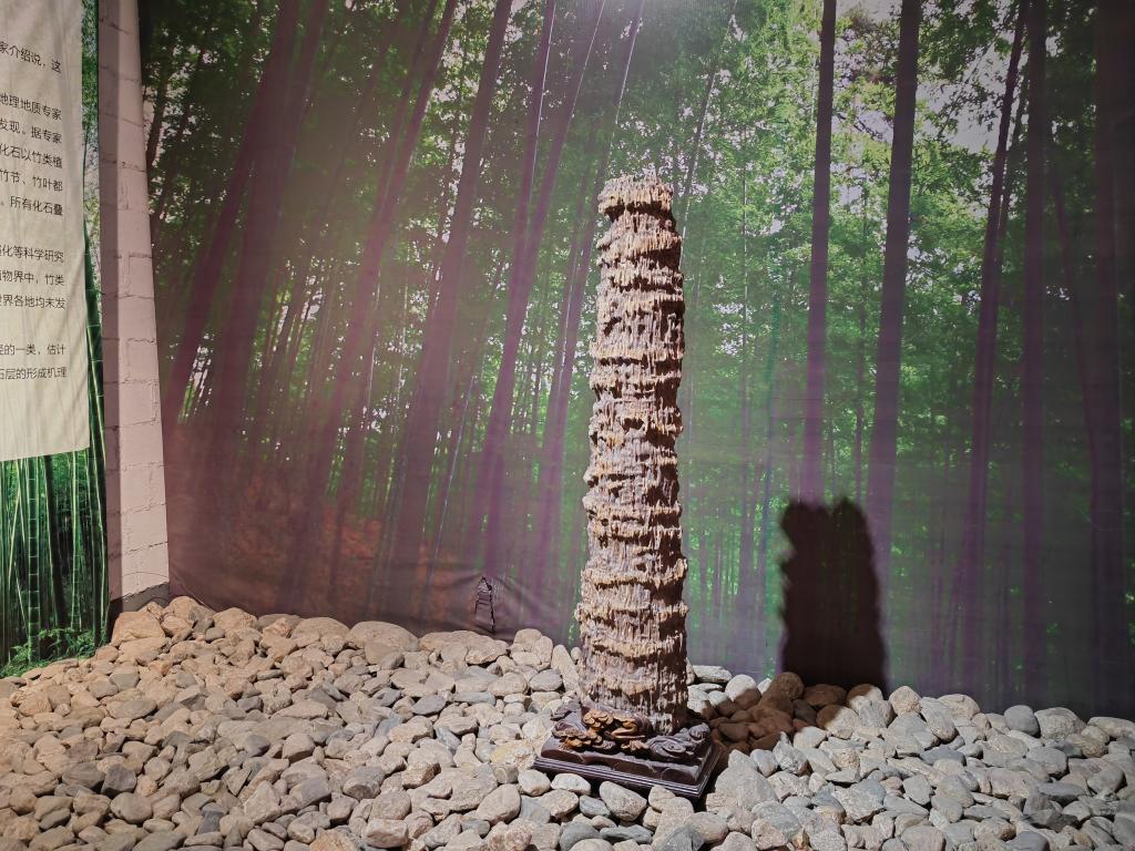 在原木標本展廳,一塊跨越萬年時光的竹化石靜靜陳列。燈光下,竹竿依舊挺拔,竹節(jié)棱角分明,葉片脈絡甚至細胞纖維都清晰可辨?!斑@些木頭會說話,它們在講述地球的故事。”姜開峰說。