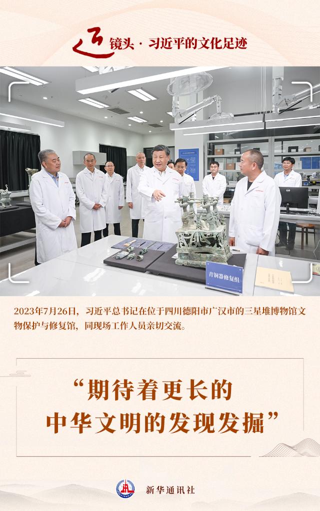2023年7月26日,習(xí)近平總書記來到這里考察,對三星堆博物館新館的落成使用表示熱烈祝賀。