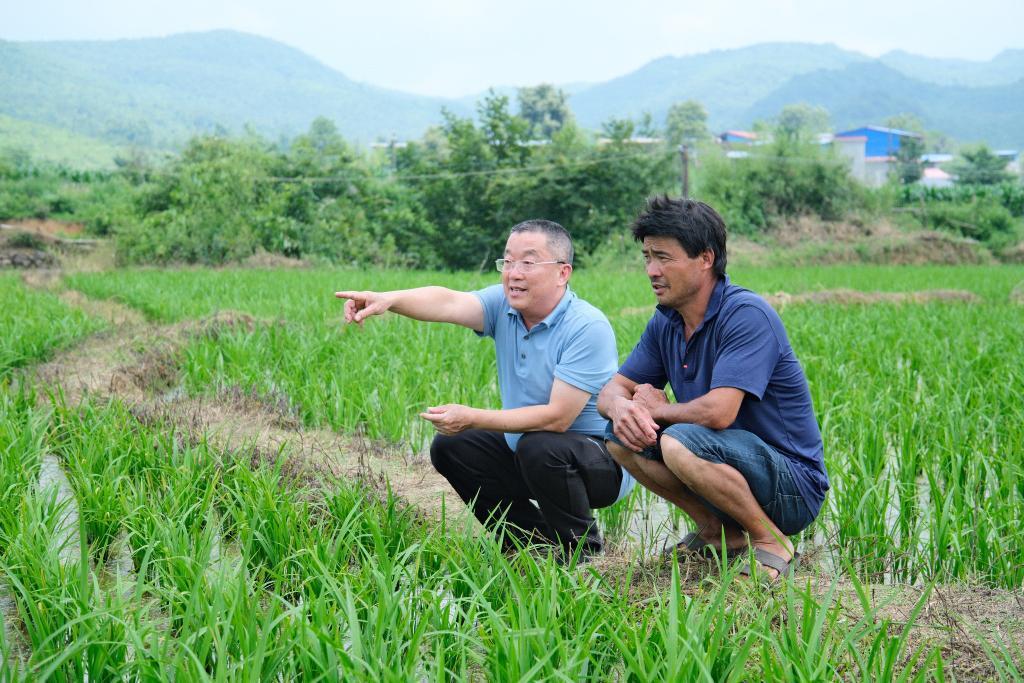 白竹村駐村第一書記莫日發(fā)(左)正在指導(dǎo)村民進(jìn)行田間管理。新華社記者 鄒雨沁 攝