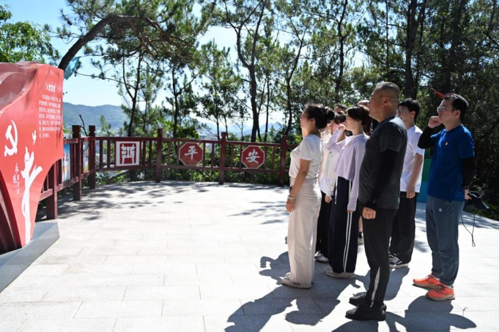 當(dāng)天上午,公園山步道入口,員工們沿著青石山道拾級(jí)而上,在司旗輕舞中,開啟紅色傳承之旅。行過百十臺(tái)階,一座由五個(gè)紅五星拱門組成的長廊掩映于青山綠翠間,百年黨史濃縮在長廊兩邊紅色飄帶形狀的黨建墻之上。一行人如同穿梭于時(shí)光隧道,經(jīng)過“1921石庫門”“1934長征門”“1949解放門”“1978幸福門”最終到達(dá)“2021復(fù)興門”。沿途,大家不時(shí)駐足,認(rèn)真閱讀紅墻上記載的從黨的一大至十九大會(huì)議的歷史沿革,學(xué)習(xí)感悟紅船精神、長征精神、紅巖精神、遵義會(huì)議精神、抗美援朝精神以及抗洪、抗震、抗疫等黨的各個(gè)時(shí)期所體現(xiàn)的革命精神和自強(qiáng)不息的奮斗精神。行程中,面對(duì)莊嚴(yán)的入黨誓詞墻,黨員們重溫入黨誓詞儀式。站在觀景平臺(tái)遠(yuǎn)眺,員工們感慨于新農(nóng)村建設(shè)欣欣向榮的景象,找尋著綠色映襯下遠(yuǎn)處甬城的最高樓,深切體會(huì)到“美好生活”背后承載的錚錚諾言和肩負(fù)的責(zé)任。