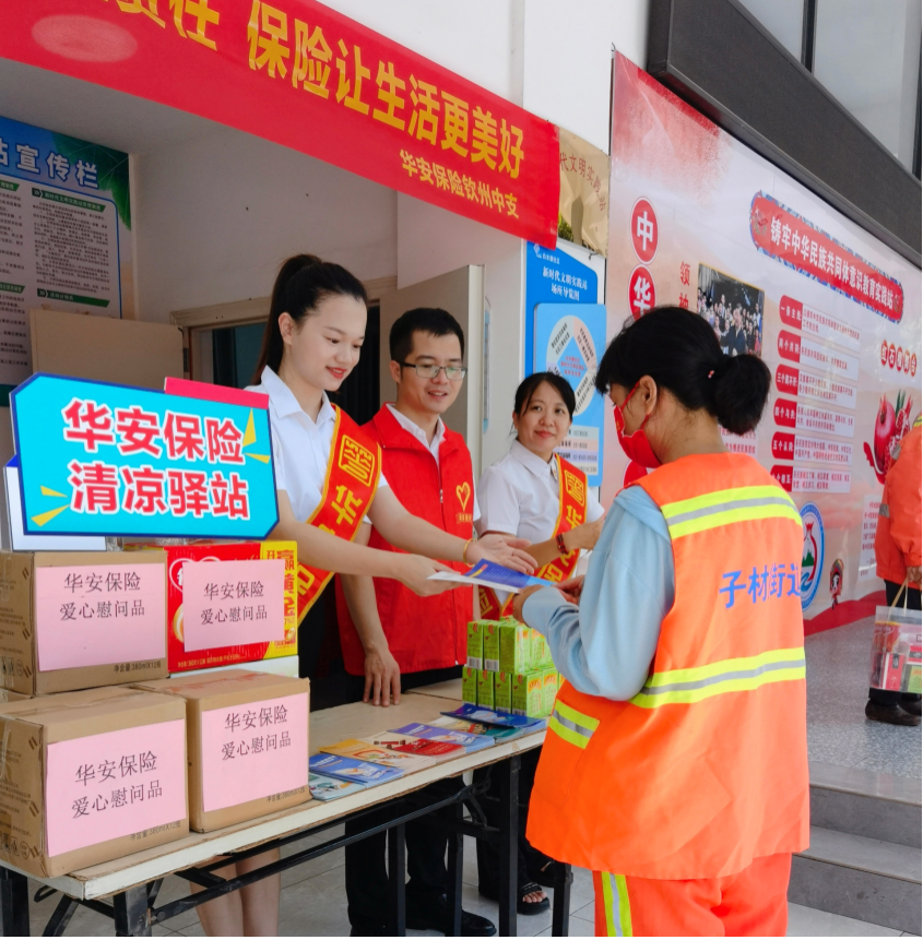 在廣西欽州白水塘社區(qū),華安保險(xiǎn)的工作人員在開展“清涼驛站”活動(dòng)慰問環(huán)衛(wèi)工人的同時(shí),也向往來群眾開展防范非法金融活動(dòng)宣傳;界首支公司在職場外設(shè)置了“清涼驛站”,連續(xù)多日為環(huán)衛(wèi)工人送上飲品、藥品和毛巾等防暑降溫物資;在湖北襄陽,工作人員前往襄州區(qū)西灣社區(qū)紅色驛站,把“清涼驛站”設(shè)在“紅色驛站”旁,一邊帶領(lǐng)員工開展紅色教育,一邊走進(jìn)社區(qū)開展保險(xiǎn)宣傳,將紅色文化與保險(xiǎn)互助理念相融合;在云南曲靖,華安保險(xiǎn)的員工參觀紅軍博物館重溫入黨誓詞,并在三百戶營村廣場組織員工和村民開展長征精神與保險(xiǎn)知識(shí)有獎(jiǎng)問答活動(dòng);在合肥蜀山區(qū)大溪地商業(yè)廣場,華安保險(xiǎn)以“納涼+公益咨詢”的創(chuàng)新形式開展宣傳,為往來客戶送去納涼神器同時(shí),也把更多金融提醒向公眾進(jìn)行宣傳;7月7日下午,華安保險(xiǎn)湖南分公司在長沙東方悅鄰商業(yè)廣場設(shè)立宣傳展臺(tái),工作人員開展夏季用電安全知識(shí)有獎(jiǎng)測試,并向過往市民普及保險(xiǎn)知識(shí)、反欺詐技巧,同時(shí)為外賣和快遞小哥贈(zèng)送消暑飲用水。
