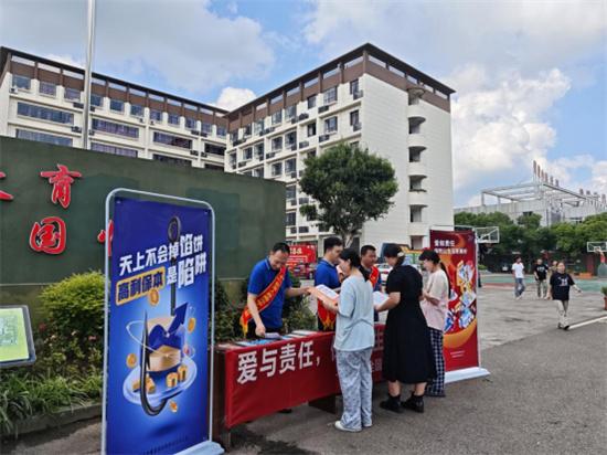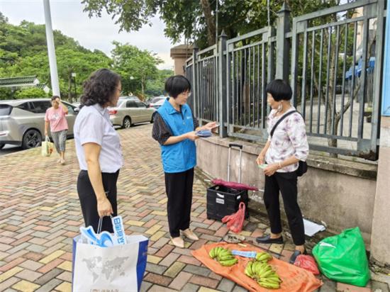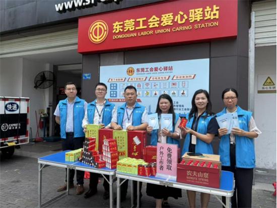 在東莞市匯峰中心,前海人壽東莞分公司的志愿者搭建起服務站點,為環(huán)衛(wèi)工人、快遞員、外賣員等戶外工作者送上清涼飲品,同時結(jié)合宣傳材料講解電信詐騙手法和防范要點,在送上夏日關懷的同時有效提升群眾金融風險防范意識。