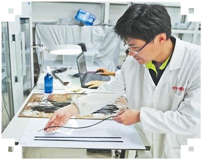 簡牘發(fā)掘、保護(hù)和修復(fù)是一場與時間的賽跑?!皠偝鐾恋闹窈嗆浀孟衩鏃l,非常脆弱,接觸空氣后極易氧化變黑,可能導(dǎo)致文字瞬間消失。”蔣魯敬說,在龍會河楚墓發(fā)掘中,他們采用“整體提取法”:以薄塑料板作“手術(shù)刀”,木托板為“擔(dān)架”,將整堆簡牘托起,并快速送往荊州文物保護(hù)中心。