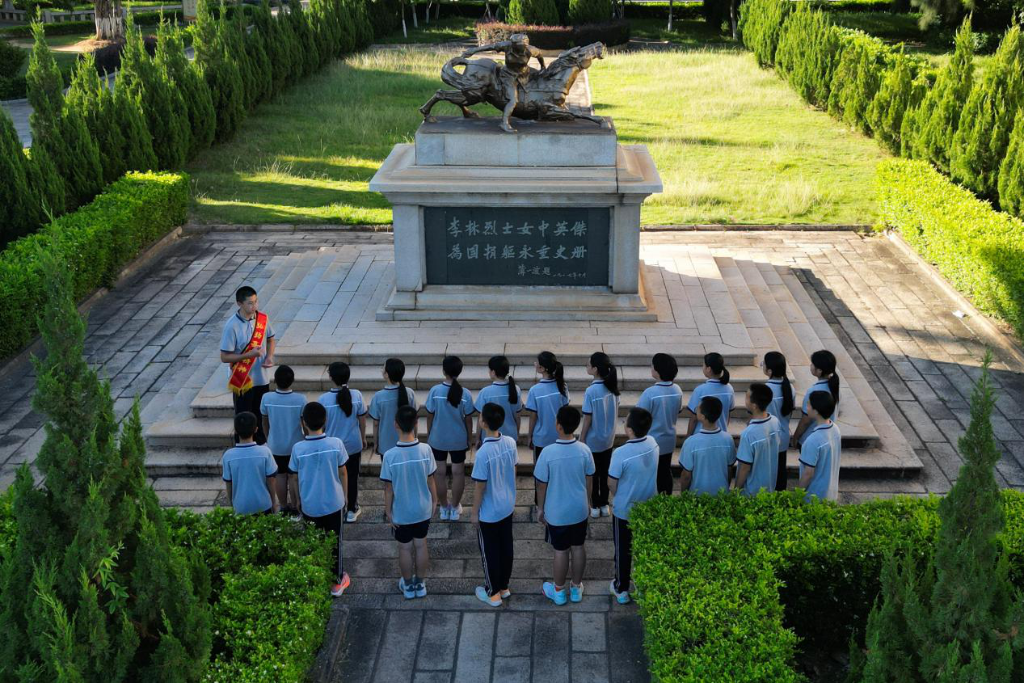 ↑福建省廈門集美中學李林園內(nèi),講解員為同學們介紹李林的事跡。(無人機照片)鐘煒俊攝