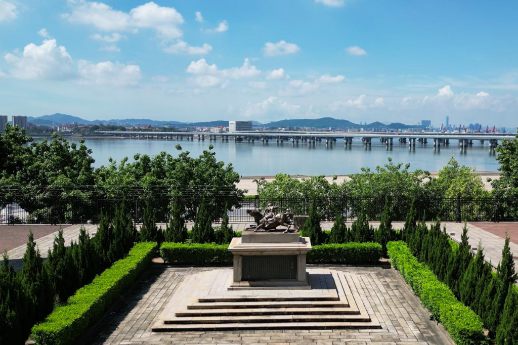 ↑福建省廈門集美中學李林園內(nèi),面海而立的李林雕像。(無人機照片)鐘煒俊攝