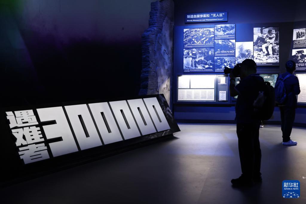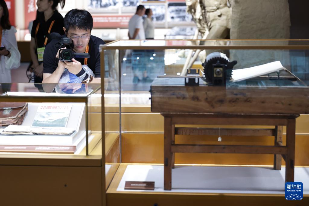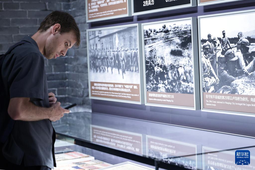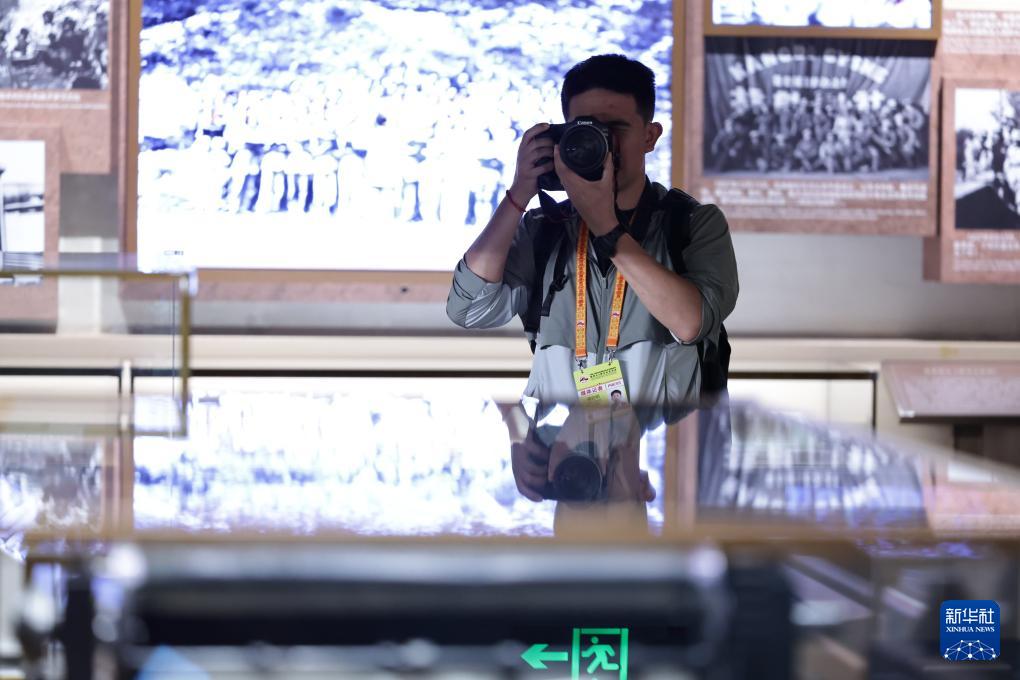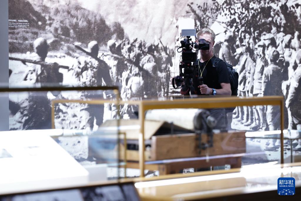 8月27日,中外媒體記者在中國(guó)人民抗日戰(zhàn)爭(zhēng)紀(jì)念館內(nèi)采訪。新華社記者 張玉薇 攝