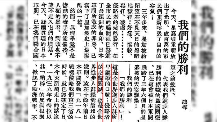 正如《星洲日?qǐng)?bào)》80年前報(bào)道中所言:“今天,全中華民族的解放戰(zhàn)爭(zhēng)、全世界進(jìn)步人群維護(hù)真理的正義戰(zhàn)爭(zhēng),已得到了光輝的勝利!這是世界史上最躍進(jìn)的一瞬、未來(lái)人類(lèi)生活偉大轉(zhuǎn)折的一天?!?完)