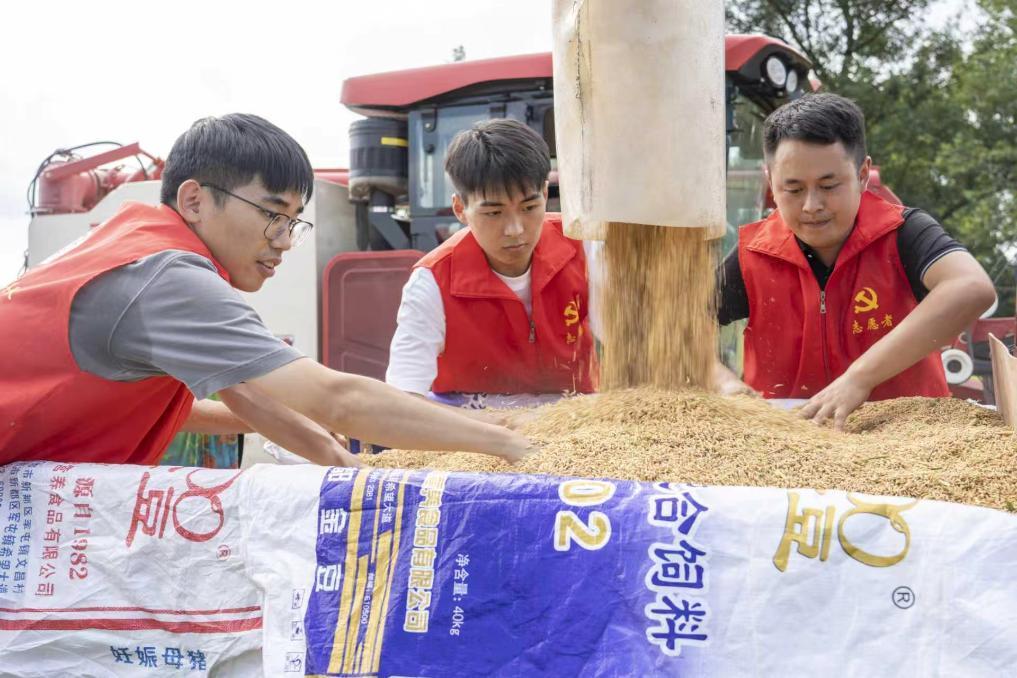 8月25日,蓬溪縣紅江鎮(zhèn)“紅色沖鋒隊(duì)”隊(duì)員助農(nóng)搶收。(受訪者供圖)