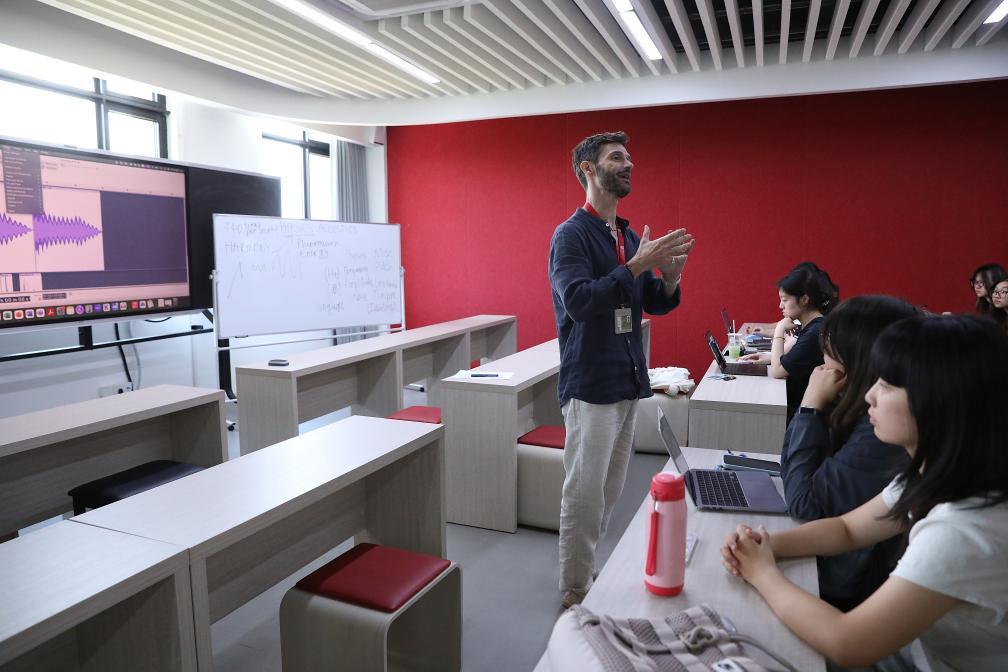 9月25日,海南陵水黎安國(guó)際教育創(chuàng)新試驗(yàn)區(qū)中央民族大學(xué)海南國(guó)際學(xué)院的外籍教師在給學(xué)生上音樂(lè)技術(shù)與作曲課。新華社記者 鄭悅 攝