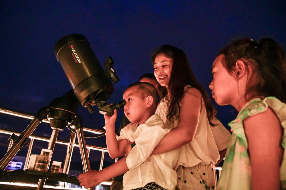 2025年7月9日,游客在貴州省平塘縣克度“天文小鎮(zhèn)”通過望遠(yuǎn)鏡觀測(cè)星空。近年來,隨著旅游設(shè)施逐漸完善,距離“中國(guó)天眼”僅8公里的克度“天文小鎮(zhèn)”通過“科普+文旅”發(fā)展模式,帶動(dòng)村民就業(yè)創(chuàng)業(yè)、增收致富。2025年1月至6月,“中國(guó)天眼”景區(qū)共接待游客約38萬(wàn)人次,總收入2496萬(wàn)余元。