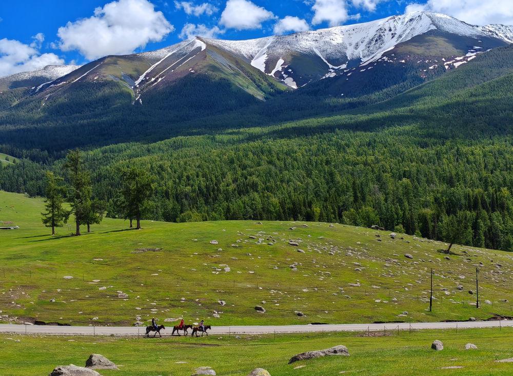 2024年6月4日,游客在新疆阿勒泰地區(qū)哈巴河縣騎馬游玩。電視劇《我的阿勒泰》播出后,新疆阿勒泰地區(qū)迎來客流高峰,“張鳳俠的小賣部”“巴太樹”“彩虹布拉克”等劇中地點(diǎn)成為熱門旅游打卡地。這場(chǎng)“邊城”與“熱劇”雙向奔赴的文旅盛宴,為當(dāng)?shù)亟?jīng)濟(jì)發(fā)展帶來新的增長(zhǎng)點(diǎn)。2024年5月,當(dāng)?shù)亟哟慰?15.03萬(wàn)人次,同比增長(zhǎng)60.81%;實(shí)現(xiàn)旅游收入36.53億元,同比增長(zhǎng)88.25%。