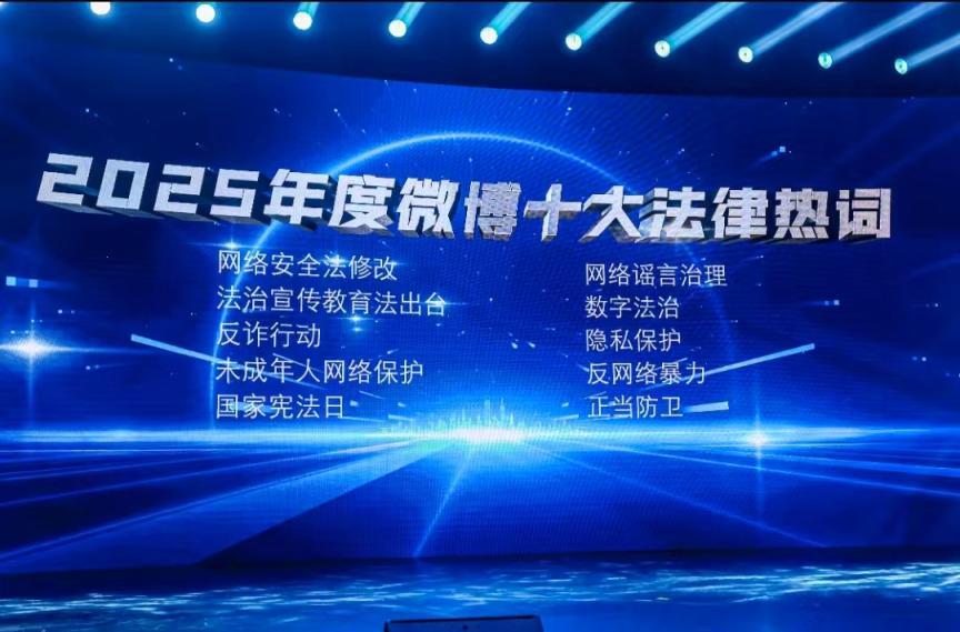 活動(dòng)現(xiàn)場還發(fā)布了“2025年度微博十大法律熱詞”,分別是:網(wǎng)絡(luò)安全法修改、網(wǎng)絡(luò)謠言治理、法治宣傳教育法出臺、數(shù)字法治、反詐行動(dòng)、隱私保護(hù)、未成年人網(wǎng)絡(luò)保護(hù)、反網(wǎng)絡(luò)暴力、國家憲法日、正當(dāng)防衛(wèi)。