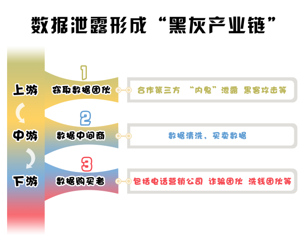 在個(gè)人信息“黑灰產(chǎn)市場(chǎng)”中,上、中、下游分工明確、緊密配合,構(gòu)成完整犯罪鏈條。首先,竊取數(shù)據(jù)團(tuán)伙作為上游“供貨商”,通過與第三方及內(nèi)部人員合作、使用黑客技術(shù)等方式拿到原始數(shù)據(jù)。其次,處于中游的“數(shù)據(jù)中間商”承接上游“供貨商”提供的原始數(shù)據(jù),并對(duì)其進(jìn)行清洗,同時(shí)尋找電話營(yíng)銷公司、詐騙團(tuán)伙等下游“買家”。最后,下游“買家”會(huì)將清洗后的數(shù)據(jù)轉(zhuǎn)化為非法獲利的工具,通過定向?qū)嵤┻`法犯罪行為達(dá)到斂財(cái)目的,由此實(shí)現(xiàn)犯罪鏈條規(guī)?;?、專業(yè)化的閉環(huán)。