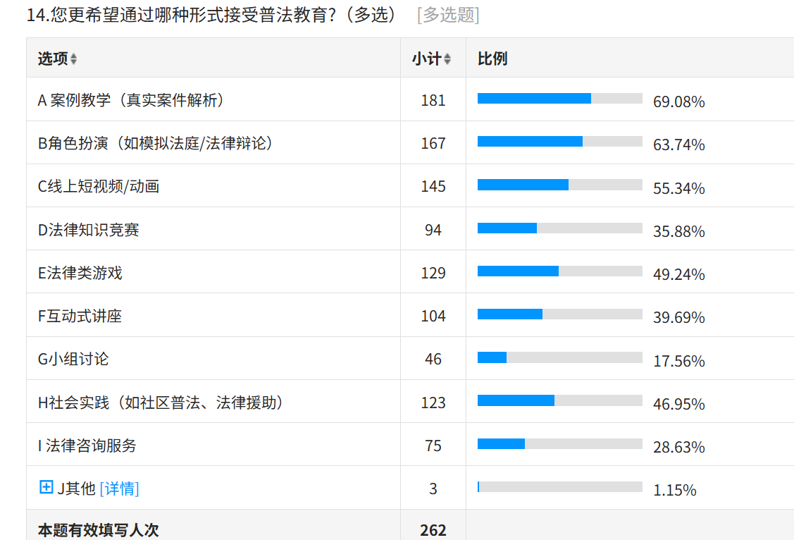 其次,高校普法實(shí)踐模式覆蓋面低。大概百分之四十多的學(xué)生反饋缺乏普法實(shí)踐,渴望在實(shí)踐中體驗(yàn)和運(yùn)用法律知識。當(dāng)前高校普法教育有的采取了模擬法庭、法律診所、實(shí)地調(diào)研等實(shí)踐教學(xué)方式,但局限于資源及其他原因,存在形式化、一次性的問題,沒有真正達(dá)到提高學(xué)生法律實(shí)踐能力的目的。
