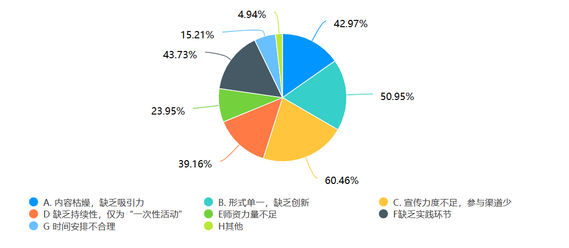 盡管高校普法教育在工作體系的建立、普法方法的探索、普法實(shí)效等方面取得很大的成績,但目前仍存在一些不足之處。筆者進(jìn)行的高校大學(xué)生普法教育調(diào)查問卷活動中,針對“你認(rèn)為當(dāng)前高校普法教育存在哪些問題?”的多選題,調(diào)查問卷結(jié)果如圖二所示,總結(jié)起來存在下列幾個(gè)方面的問題及原因: