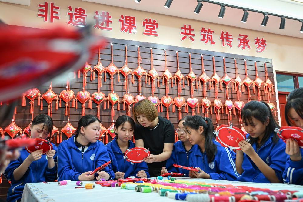 2025年9月26日,內(nèi)蒙古興安盟科右中旗巴彥呼舒第六中學(xué)美術(shù)教師、非遺傳承人吳斯琴(左四)指導(dǎo)學(xué)生刺繡。近年來,學(xué)校將當(dāng)?shù)貒壹壏沁z圖什業(yè)圖刺繡引入校園,開設(shè)課程,并成立興趣社團(tuán),讓學(xué)生們近距離感受非遺的魅力,弘揚(yáng)和傳承傳統(tǒng)文化。