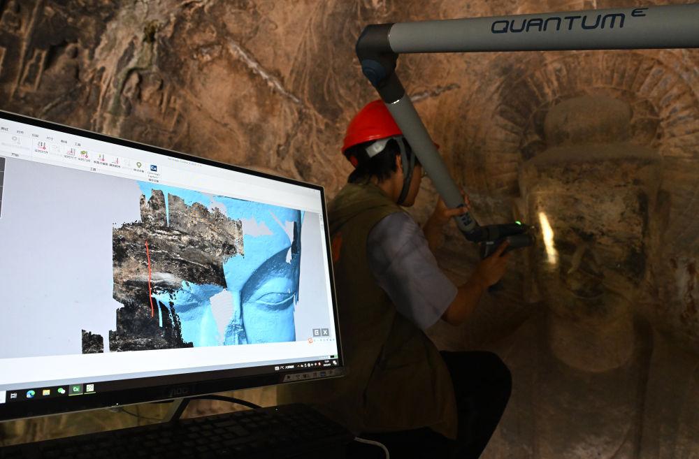 2025年4月9日,武漢大學(xué)文化遺產(chǎn)智能計(jì)算實(shí)驗(yàn)室團(tuán)隊(duì)成員在河南洛陽龍門石窟魏字洞使用關(guān)節(jié)臂掃描儀對佛像進(jìn)行數(shù)字化掃描。龍門石窟研究院為石窟建立數(shù)字化檔案,借助激光掃描、高清攝影等技術(shù)手段收集文物數(shù)據(jù),以數(shù)字的形式留存千年石刻群的風(fēng)貌,致力于讓這一規(guī)模宏大、氣勢磅礴的石窟瑰寶“芳華永駐”。