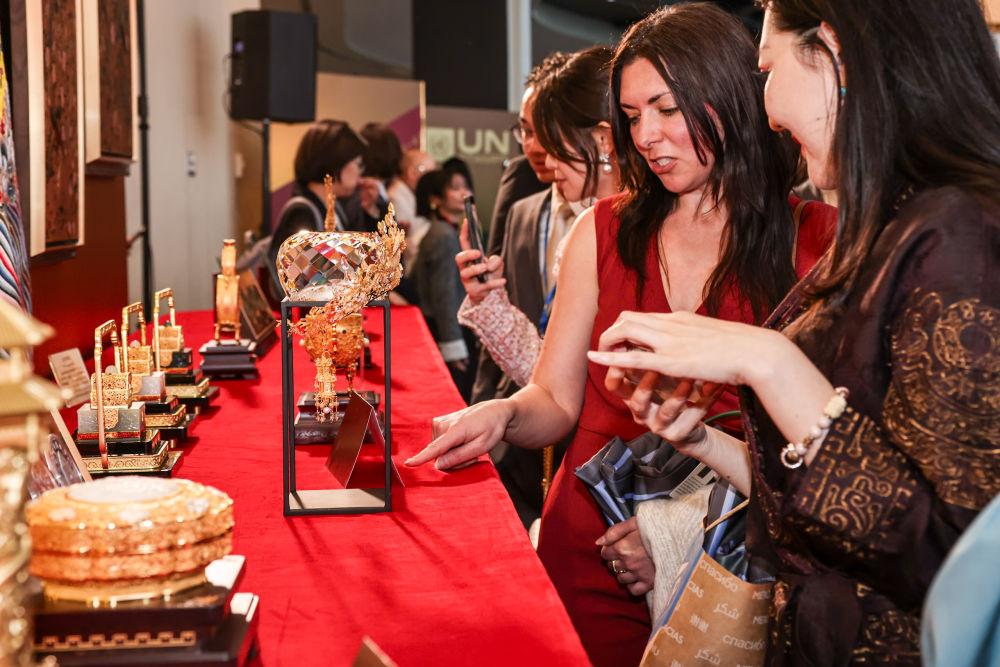 2025年5月19日,“生生不息——故宮文創(chuàng)走進(jìn)聯(lián)合國主題展”開幕式暨故宮博物院成立100周年郵票發(fā)布儀式在聯(lián)合國總部舉行,120余位各國駐聯(lián)合國大使及國際組織代表參加。這是人們在參觀展覽。