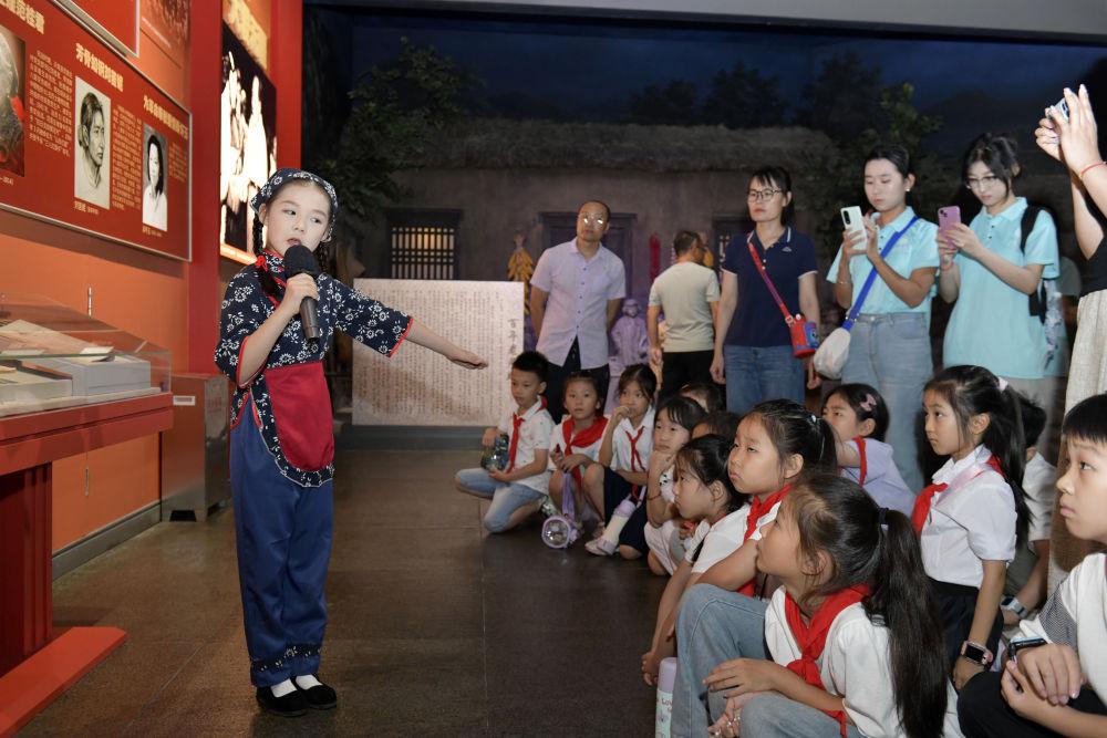 2025年8月7日,在山東沂蒙革命紀(jì)念館,臨沂市沂蒙紅孩子文藝先鋒隊(duì)的房沫昕在講述紅色故事《沂蒙紅嫂祖秀蓮》。沂蒙紅孩子文藝先鋒隊(duì)以“傳承沂蒙精神”為宗旨,通過歌舞、朗誦、故事講述、舞臺劇等紅色主題文藝節(jié)目,以深情表演弘揚(yáng)主旋律,增強(qiáng)紅色文化感染力,為紅色基因代代相傳注入新生力量。