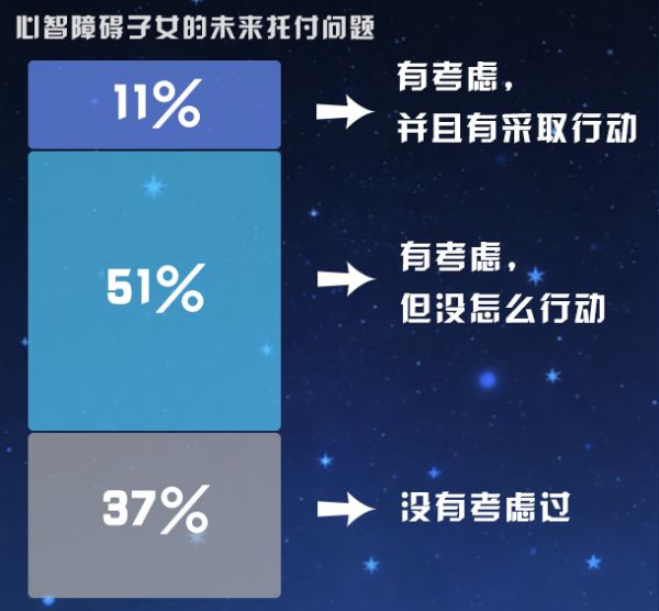 根據(jù)《心智障礙者家庭需求與未來(lái)托付調(diào)研報(bào)告》顯示,僅11%的家庭考慮過(guò)心智障礙子女的未來(lái)托付問(wèn)題,并采取了行動(dòng);51%的家庭只是考慮過(guò)相關(guān)問(wèn)題,但是沒(méi)有采取行動(dòng);而37%的家庭壓根沒(méi)有考慮過(guò)相關(guān)問(wèn)題。