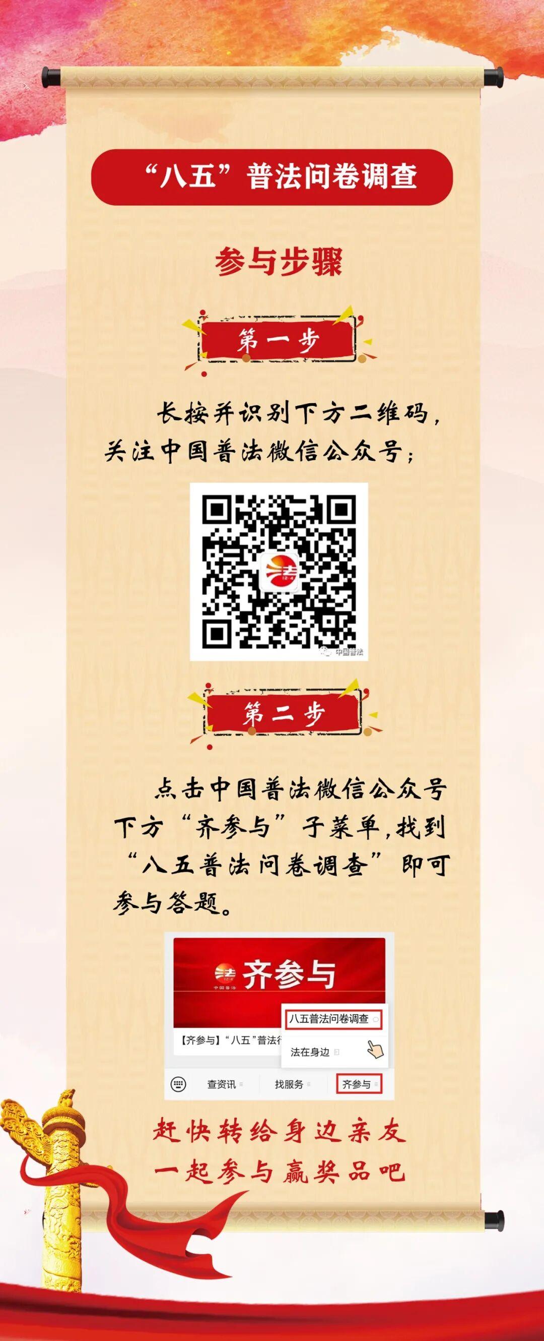 關(guān)注“中國普法”微信公眾號,點擊手機下方“齊參與”菜單,找到“八五普法問卷調(diào)查”,進(jìn)入問卷調(diào)查頁面即可。