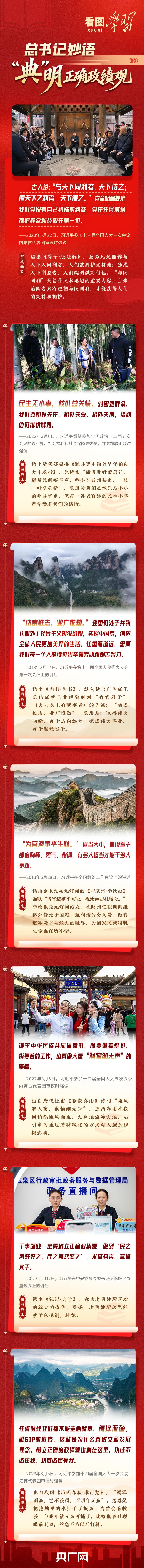 從殷殷囑托“民生無(wú)小事,枝葉總關(guān)情”“功崇惟志,業(yè)廣惟勤”,到悉心叮囑要做好“潤(rùn)物細(xì)無(wú)聲”的“潛績(jī)”,再到嚴(yán)肅指出任何時(shí)候都不能走急就章、竭澤而漁……總書(shū)記曾多次引經(jīng)據(jù)典、援古論今,深刻闡釋什么是正確政績(jī)觀、怎樣踐行正確政績(jī)觀,意蘊(yùn)深遠(yuǎn),發(fā)人深省。