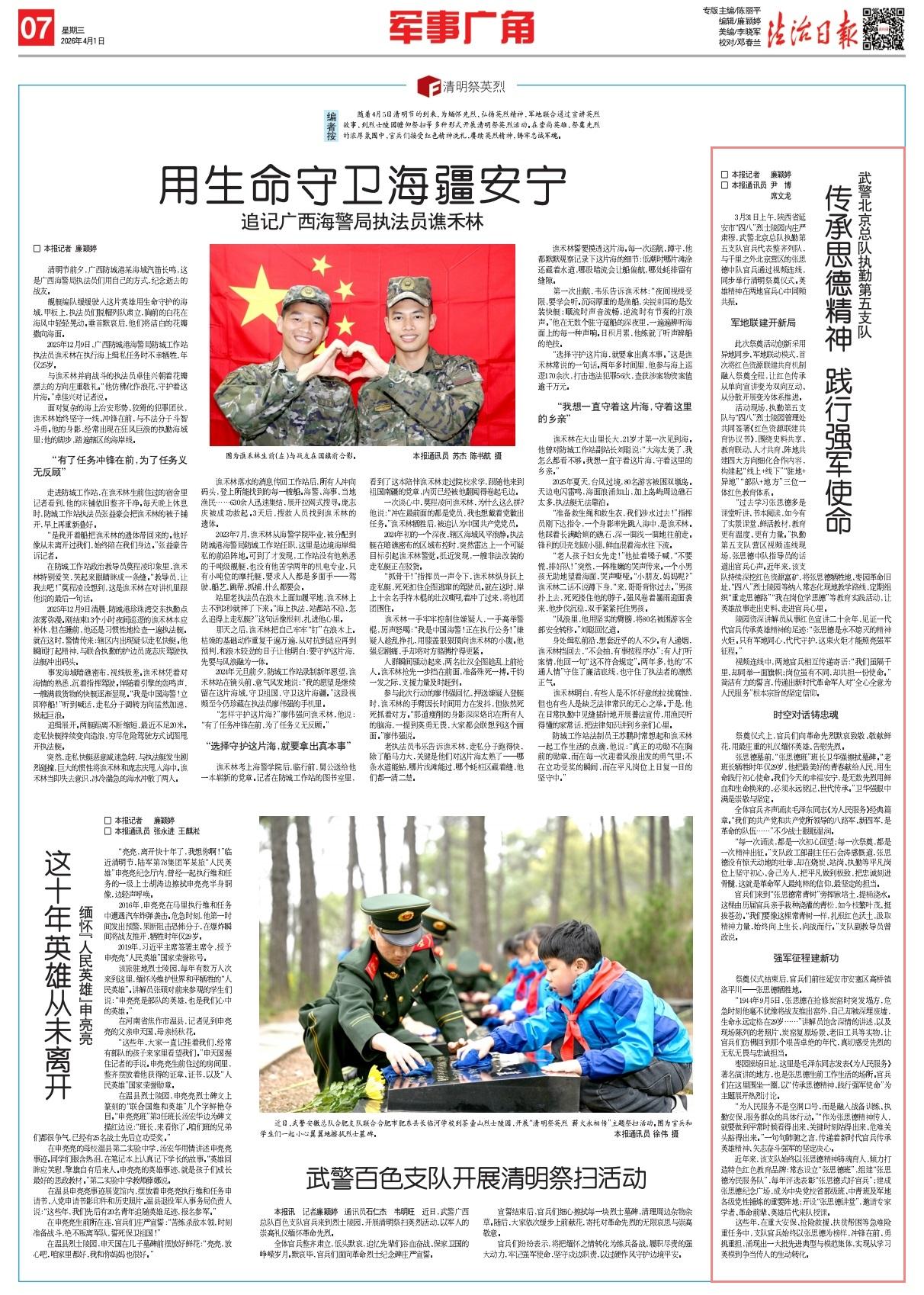 3月31日上午,陜西省延安市“四八”烈士陵園內(nèi)莊嚴(yán)肅穆,武警北京總隊(duì)執(zhí)勤第五支隊(duì)官兵代表整齊列隊(duì),與千里之外北京營區(qū)的張思德中隊(duì)官兵通過視頻連線,同步舉行清明祭奠儀式。英雄精神在兩地官兵心中同頻共振。