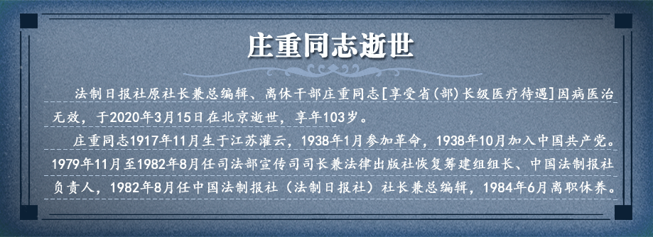莊重老社長逝世,我很悲慟。悲慟之余,他在法制報創(chuàng)辦初期的感人事跡浮現(xiàn)在我的腦海中。 1979年,中央組織部向在京各部委發(fā)文,要求抽調(diào)一批干部支援公安部、最高檢、最高法、司法部、民政部、安全部。莊重同志于1979年11月調(diào)入司法部,分配在宣傳司為負責人,同時領導籌備法制報,這時宣傳司與法制報為同一個單位,兩年后分開。分開時莊重為宣傳司司長、法制報社黨委書記、社長、總編輯,一時身兼四職,可見人氣十足。【詳細】