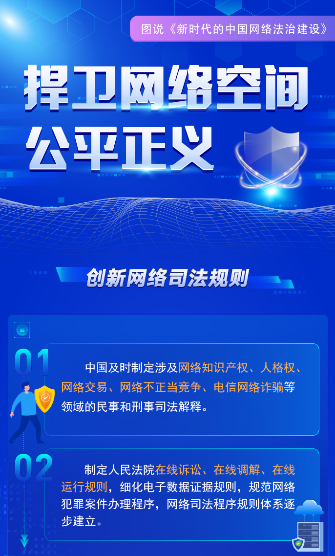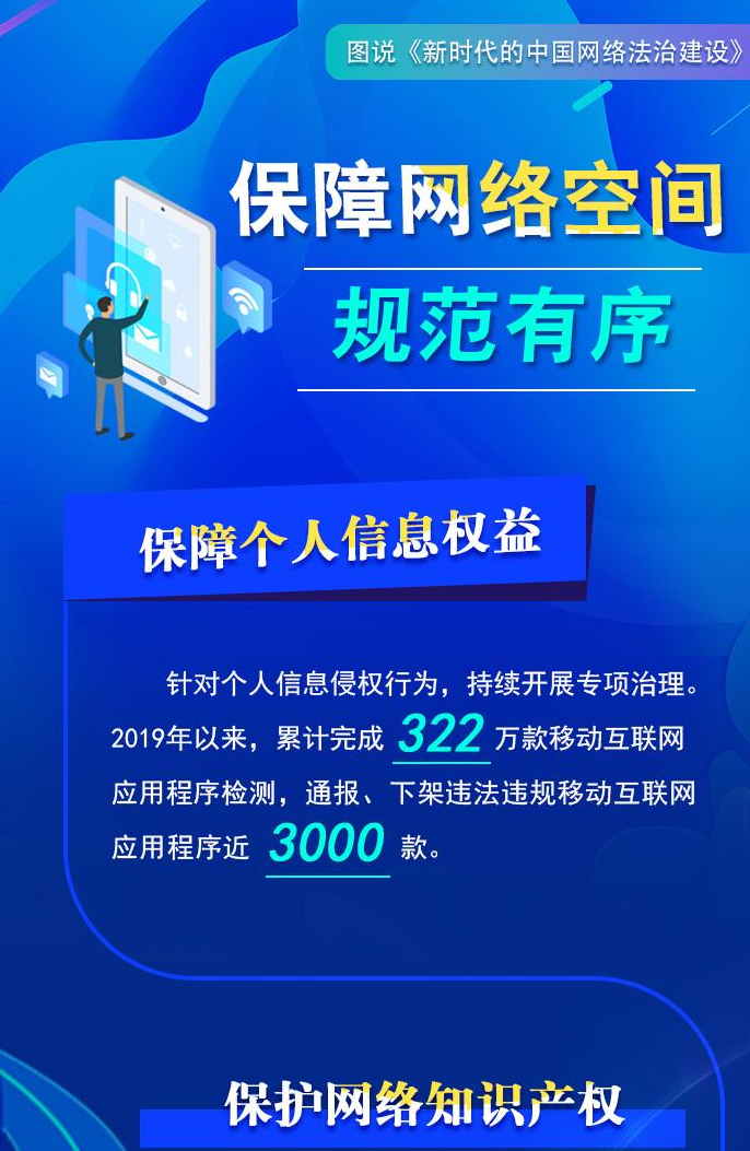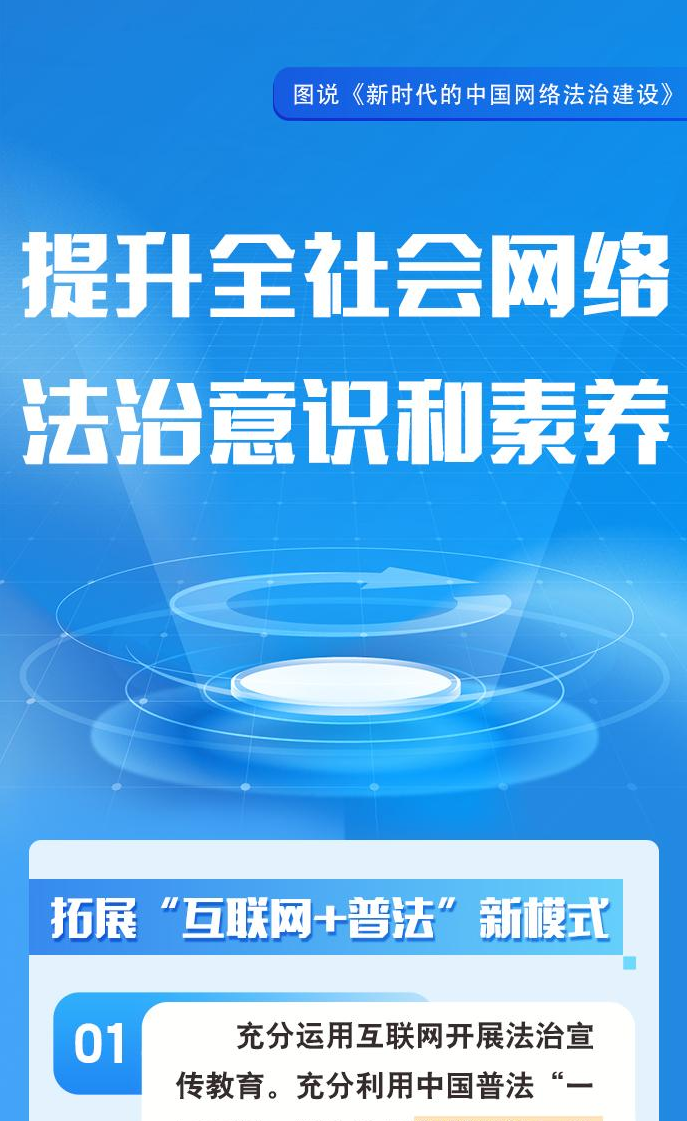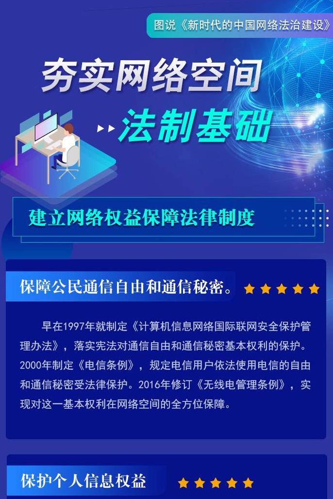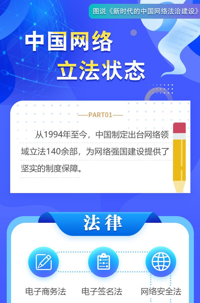 自1994年全功能接入國際互聯(lián)網(wǎng)以來,中國堅持依法治網(wǎng),持續(xù)推進網(wǎng)絡空間法治化,推動互聯(lián)網(wǎng)在法治軌道上健康運行。進入新時代,在習近平新時代中國特色社會主義思想指引下,中國將依法治網(wǎng)作為全面依法治國和網(wǎng)絡強國建設重要內容,努力構建完備的網(wǎng)絡法律規(guī)范體系、高效的網(wǎng)絡法治實施體系、嚴密的網(wǎng)絡法治監(jiān)督體系、有力的網(wǎng)絡法治保障體系,網(wǎng)絡法治建設取得歷史性成就。