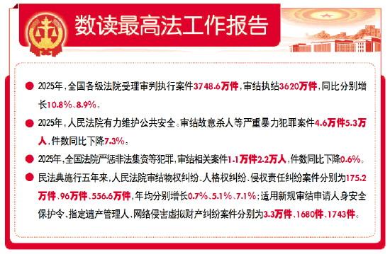 報告著重強調(diào)“恪守公平正義”,圍繞“保障高水平安全”“服務高質(zhì)量發(fā)展”“守護高品質(zhì)生活”“助力高水平開放”等方面,回顧了2025年人民法院各項工作。