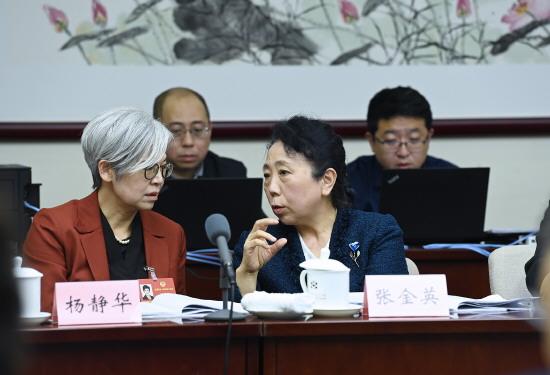 圖② 3月9日,全國政協(xié)十四屆四次會(huì)議舉行小組會(huì)議。圖為兩位政協(xié)委員在會(huì)議間隙分享履職感受。 本報(bào)記者 范瑞恒 攝
