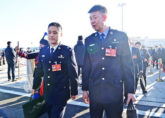 圖① 3月9日,十四屆全國人大四次會(huì)議第二次全體會(huì)議在北京人民大會(huì)堂舉行。圖為兩位公安代表步入會(huì)場。 本報(bào)記者 范瑞恒 攝