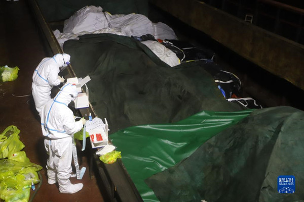 中國(guó)海警局直屬第二局執(zhí)法員對(duì)涉案凍品進(jìn)行取樣檢測(cè)(2月12日攝)。新華社發(fā)(張淼 攝)