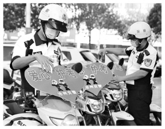 高考在即,河北省滄州市交警提前部署高考護(hù)考管控措施,為接送考生車輛“護(hù)航”。圖為滄州市公安交警支隊(duì)二大隊(duì)鐵騎交警為警用摩托車粘貼“愛(ài)心護(hù)考”標(biāo)識(shí)牌。