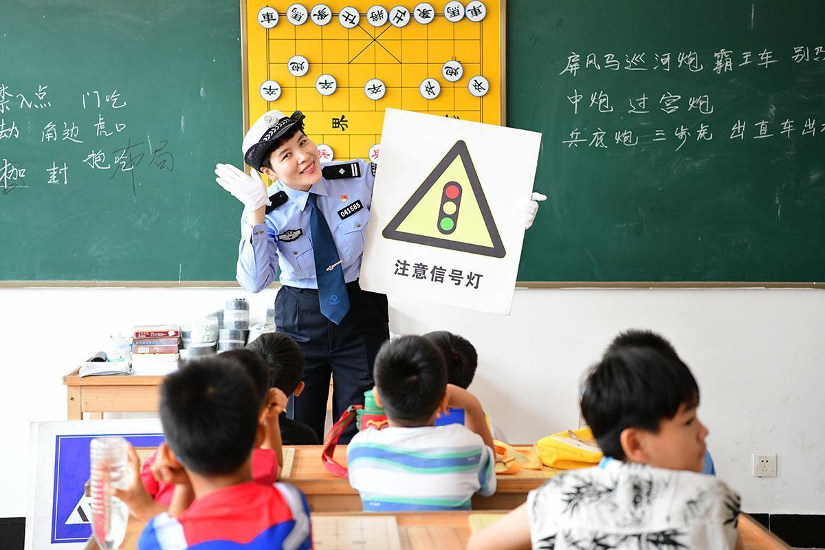 7月17日,安徽省阜南縣公安局交管大隊民警在少年活動中心為暑期興趣班學(xué)生講解出行安全知識,增強學(xué)生出行安全意識。圖為民警向?qū)W生介紹交通標識。