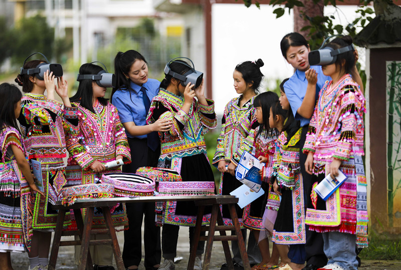 8月2日,貴州省黔西市人民檢察院檢察官來到協(xié)和鎮(zhèn)楊柳社區(qū)的苗寨里,開展“法治宣傳進(jìn)苗寨”宣傳活動(dòng)。圖為檢察官利用VR眼鏡,讓村民體驗(yàn)吸毒對(duì)人體的危害。
