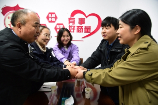11月23日,山東省棗莊市市中區(qū)司法局龍山路司法所工作人員和人民調(diào)解員正在調(diào)解一起因鄰里瑣事引發(fā)的糾紛。