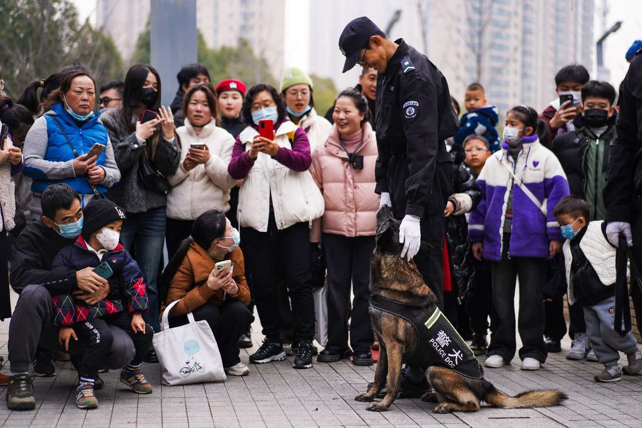 1月7日,湖北省武漢市公安局舉行主題為“平安武漢 共同締造”的警營開放日活動(dòng),黨風(fēng)政風(fēng)警風(fēng)監(jiān)督員、醫(yī)護(hù)工作者、網(wǎng)約車司機(jī)、金融從業(yè)人員等社會(huì)各界萬余名群眾來到現(xiàn)場,零距離觀摩、體驗(yàn)公安工作和警營文化。圖為群眾與剛剛完成搜毒演練科目的警犬及其訓(xùn)導(dǎo)員互動(dòng)。