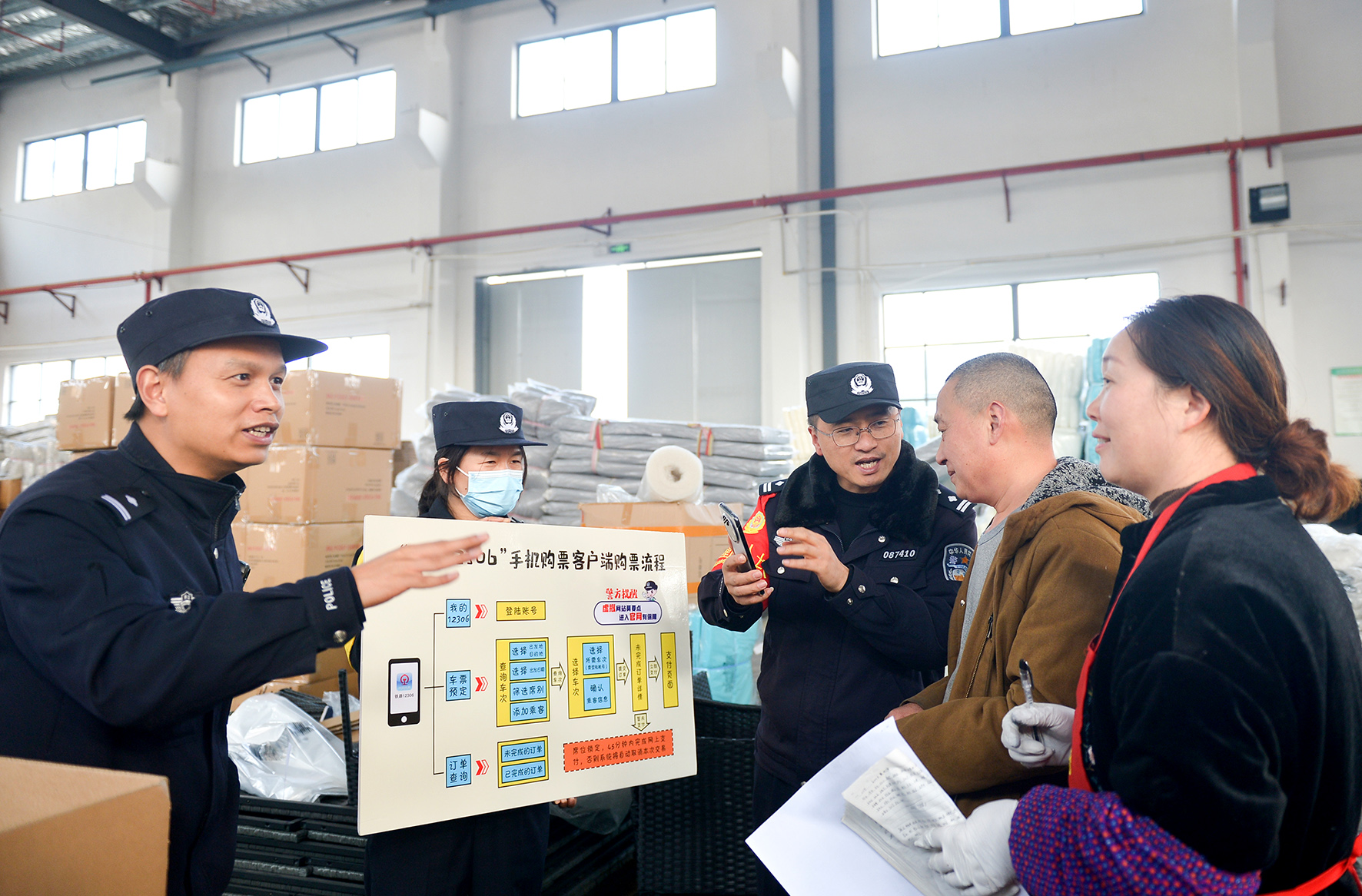 1月15日,杭州鐵路公安處臺(tái)州站派出所民警在企業(yè)車間,指引務(wù)工人員在鐵路12306官方平臺(tái)購(gòu)買春運(yùn)期間車票。