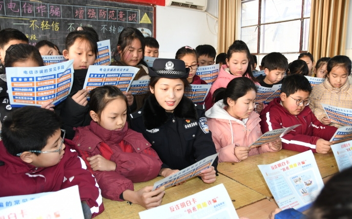 近日,河南省??h公安局衛(wèi)溪派出所組織民警走進(jìn)中小學(xué)校開(kāi)設(shè)“平安課堂”,向?qū)W生宣傳講解安全防范知識(shí)。圖為民警向?qū)W生發(fā)放《反詐明白卡》,并講解反詐防詐知識(shí)。