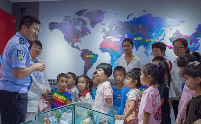 近日,新疆伊犁邊境管理支隊可克達拉邊境派出所在轄區(qū)禁毒教育基地,運用VR體驗、全息成像、人工智能等高科技手段,為轄區(qū)幼兒園的小朋友們上了一堂生動的禁毒宣傳教育課。圖為民警為孩子們介紹毒品的危害性。