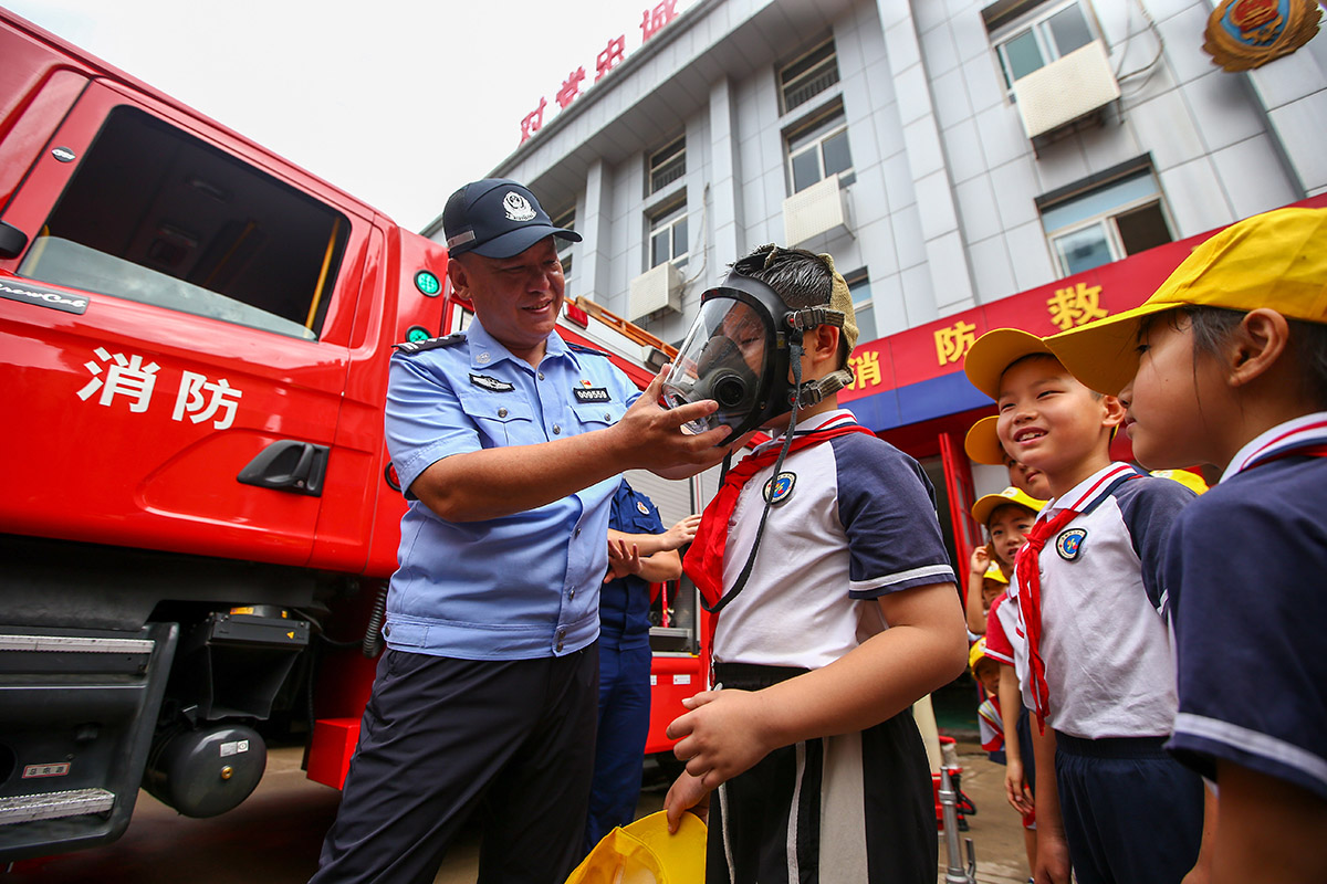 7月16日,山東省濟(jì)南市公安局市中分局六里山派出所聯(lián)合玉函北社區(qū),組織玉函小學(xué)學(xué)生走進(jìn)英雄山路消防救援站開展暑假研學(xué)活動(dòng)。圖為民警指導(dǎo)學(xué)生體驗(yàn)消防裝備。