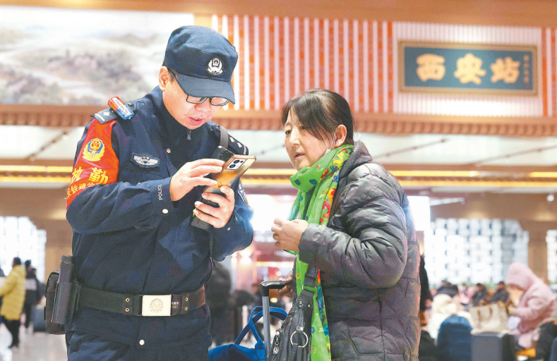 1月1日,西安鐵路公安局西安公安處民警堅守崗位,護(hù)航旅客平安出行。圖為民警在西安火車站候車室?guī)椭每徒鉀Q問題。