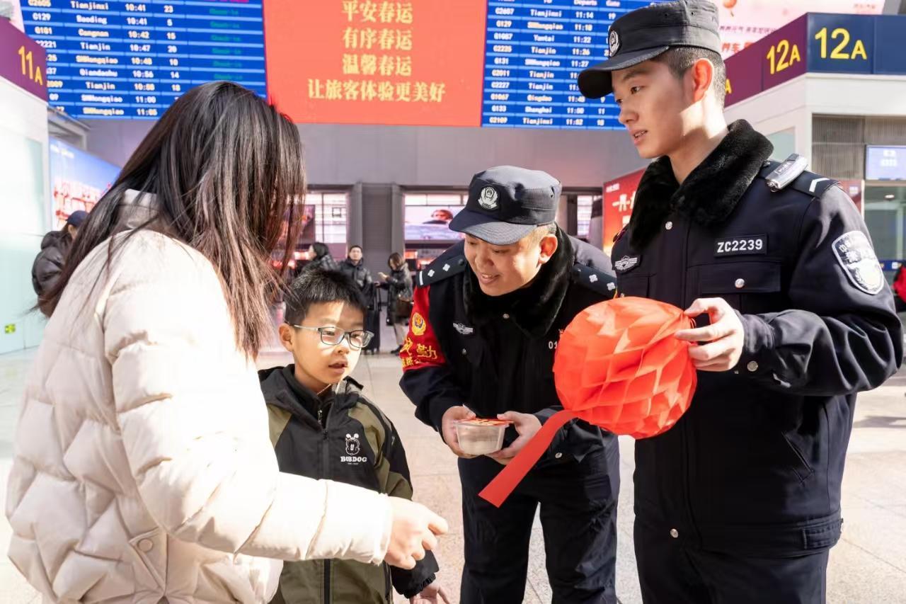 2月12日是農歷元宵佳節(jié),北京鐵路公安處北京南站派出所民警走到旅客中間,開展安全出行猜燈謎活動。據悉,鐵路民警制作的燈謎謎面涵蓋反詐宣傳、乘車安全、平安出行常識等內容,并結合春運出行,提醒旅客旅途中提高安全防范意識。圖為民警邀請旅客猜燈謎并送上可口的元宵。