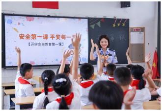 9月1日,開學(xué)首日,江蘇省常州市公安局鐘樓分局北大街派出所組織民警走進(jìn)覓渡橋小學(xué),開展“開學(xué)安全教育第一課”法治宣講活動。圖為民警在課堂上與學(xué)生們互動。