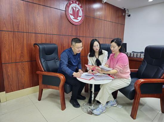圖為周秋妤(右一)和同事一起對疑難復(fù)雜案件進(jìn)行合議,研究實(shí)質(zhì)化解行政爭議路徑。 廣州市司法局供圖