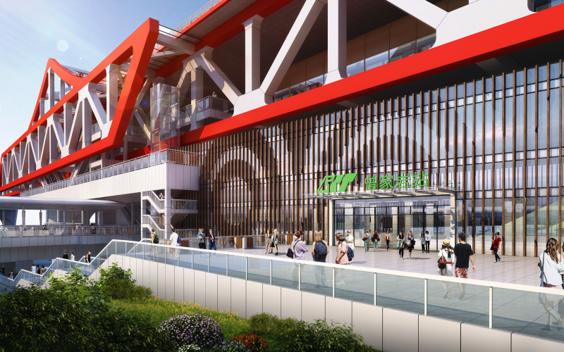 為使車站與大橋形成有機共生體,曾家?guī)r站外立面桁架采用大橋主體結(jié)構(gòu)的造型元素,換乘平臺采用鋼結(jié)構(gòu)+玻璃欄桿、改建站房采用深色材料形成陰影效果。此外,車站換乘平臺采用玻璃欄桿,外形獨特,形似空中大廳,視野極佳。