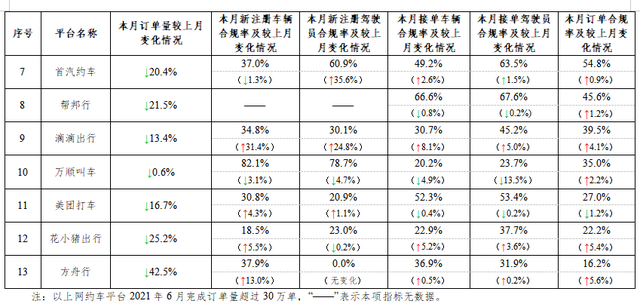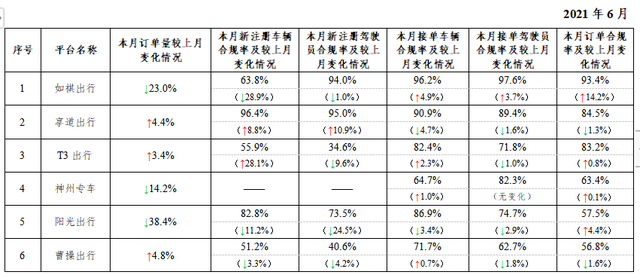 一、在訂單量超過(guò)30萬(wàn)單的網(wǎng)約車(chē)平臺(tái)中,訂單合規(guī)率最高的是如祺出行,最低的是方舟行。2021年6月訂單量超過(guò)30萬(wàn)單的網(wǎng)約車(chē)平臺(tái)共13家。與5月份相比,招招出行、東風(fēng)出行從5月訂單量超過(guò)30萬(wàn)單降到30萬(wàn)單以下。按訂單合規(guī)率(指駕駛員和車(chē)輛均獲得許可的訂單量占比)從高到低的分別是如祺出行、享道出行、T3出行、神州專(zhuān)車(chē)、陽(yáng)光出行、曹操出行、首汽約車(chē)、幫邦行、滴滴出行、萬(wàn)順叫車(chē)、美團(tuán)打車(chē)、花小豬出行、方舟行。本月訂單合規(guī)率增長(zhǎng)排名前3名的分別是如祺出行、方舟行、花小豬出行;下降最多的分別是曹操出行、享道出行、美團(tuán)打車(chē)。