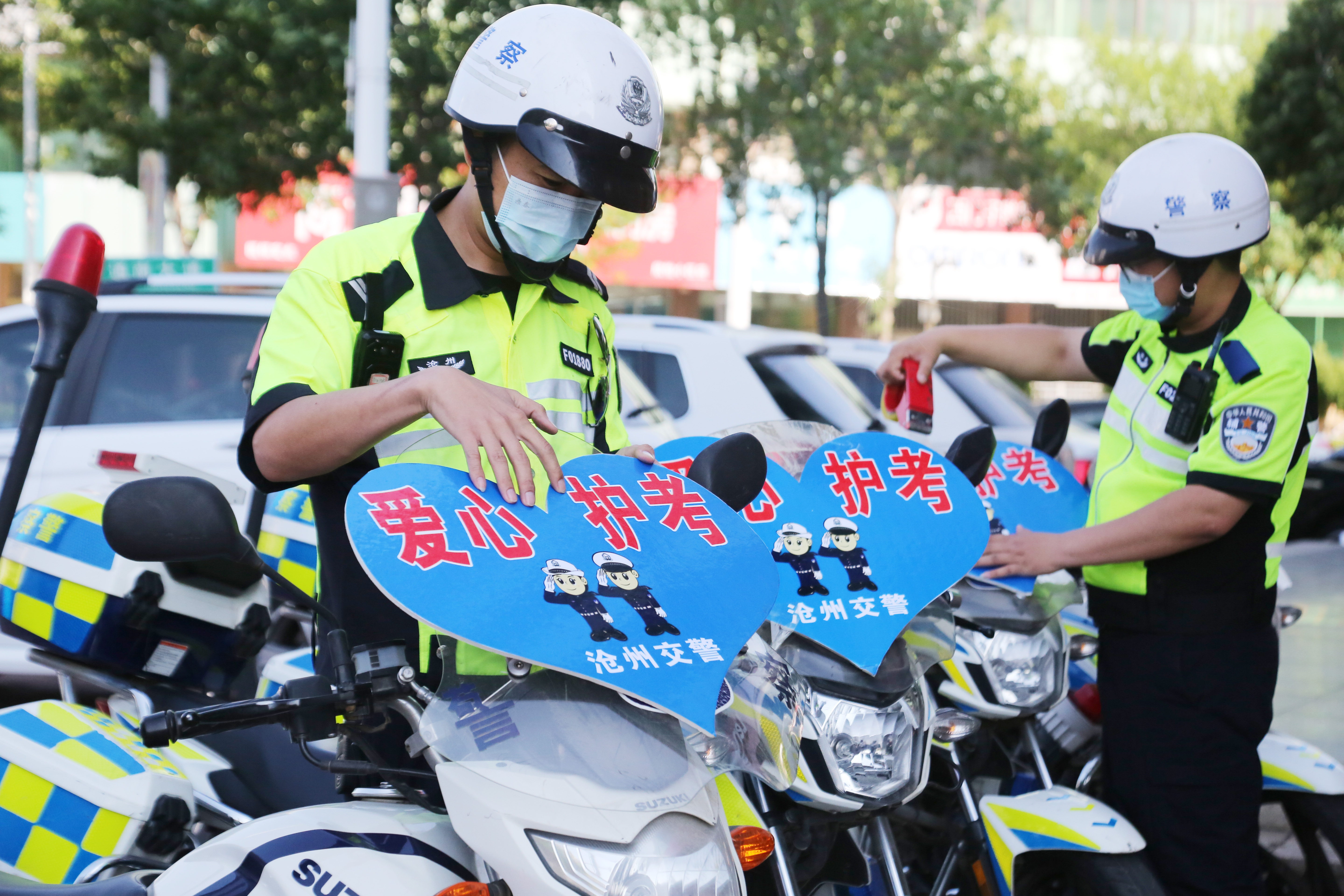 高考在即,河北省滄州市交警提前部署高考護(hù)考管控措施,參加維護(hù)高考交通秩序和護(hù)送考生車輛的執(zhí)勤交警提前進(jìn)入高考狀態(tài),以良好的精神狀態(tài)為高考學(xué)子和接送考生的車輛“護(hù)航”。圖為滄州市公安交警支隊(duì)二大隊(duì)鐵騎交警提前行動(dòng),細(xì)心檢查摩托車機(jī)械運(yùn)行狀況、粘貼“愛(ài)心護(hù)考”標(biāo)識(shí)牌,“備戰(zhàn)”高考。